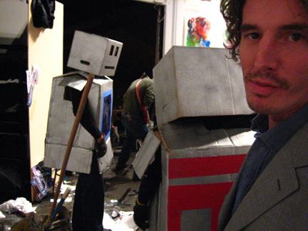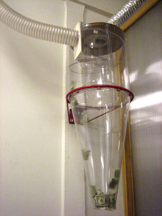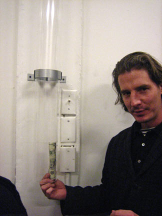 At Machine Project, we saw a great play acted out by lighting fixtures. Paul is feeding money to the donation pneumatic tube |