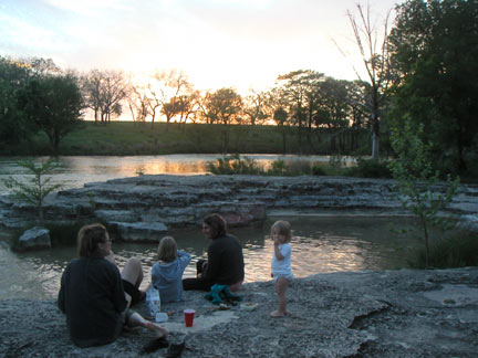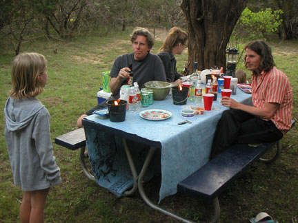 A picnic next to the river -- that's Ella presenting Alamo history to Paul's brother Richard, Carole and Paul.